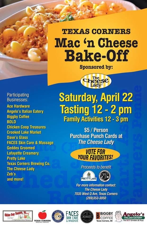 Texas Corners Mac 'n Cheese Bake-off--Saturday, April 22 beginning at 12pm sponsored by the Downtown Development Authority of Texas Corners. Punch cards are available at the Cheese Lady for $5.00. A punch card purchased entitles the holder to sample over 20 adaptations of Macaroni & Cheese from Texas Corners restaurants and civic groups. Lafayette Creamery is on the punch card with the creation of Mac 'n Cheese ice cream--sounds terrible, right? We think you'll be surprised. Details below, or you can click HERE to head straight to the facebook event!