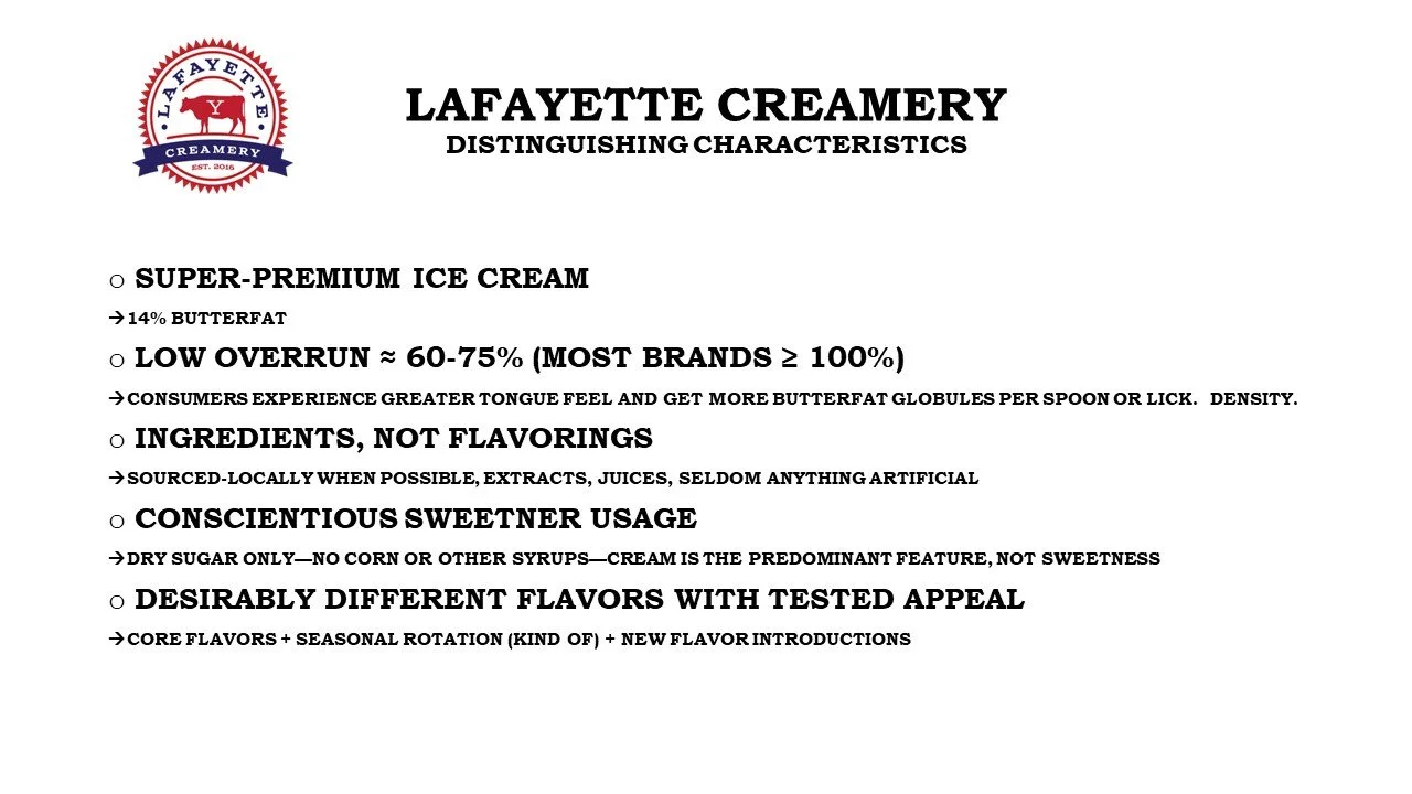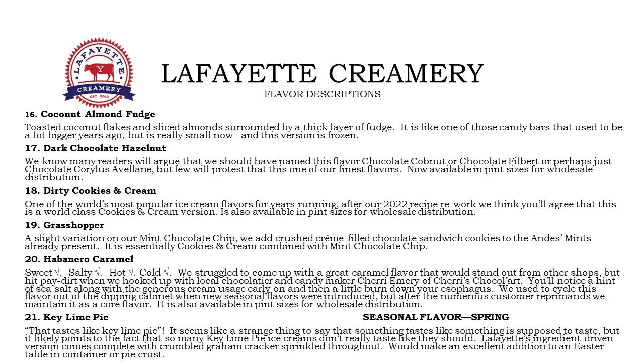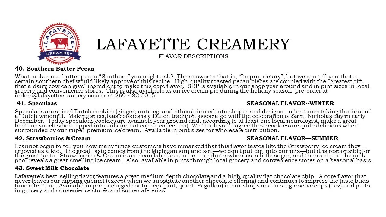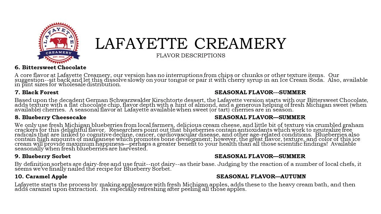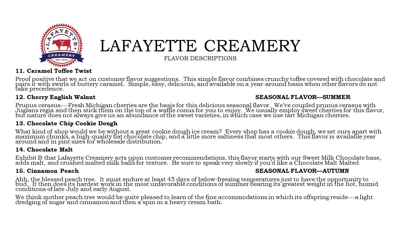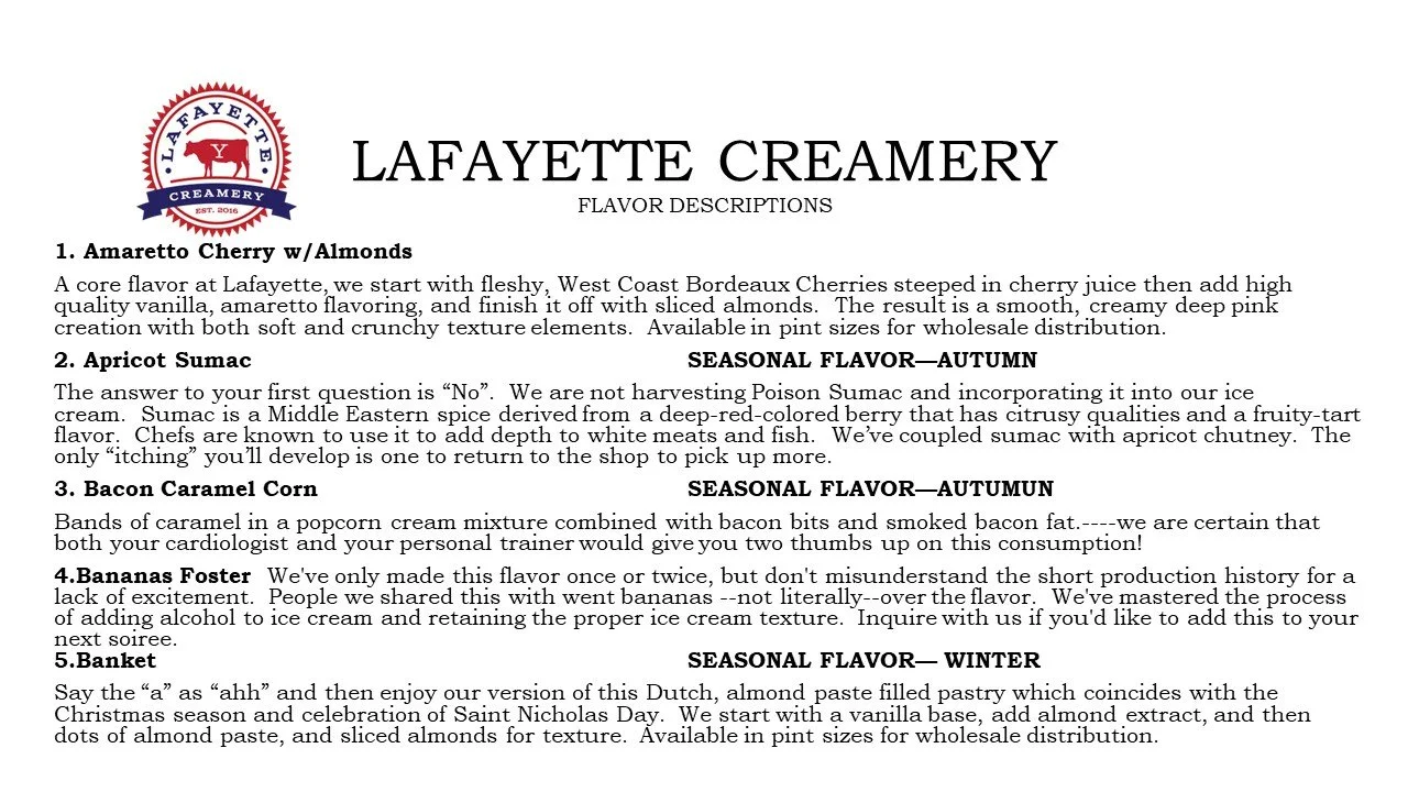 Since our founding in 2016 Lafayette Creamery has been pleased to partner with restaurateurs, caterers, and chefs in supplying ice cream as a featured or complementary dessert option. Our flavor list, descriptions, and additional information can be found below.. Our talented production team and our small batch size also enables us to create custom desserts for one-off events such as charity and non-profit fundraisers at competitive pricing levels. You are encouraged to reach out to cybema@lafayettecreamery.com or at 269-599-3763 to inquire of our capabilities and turnaround time.